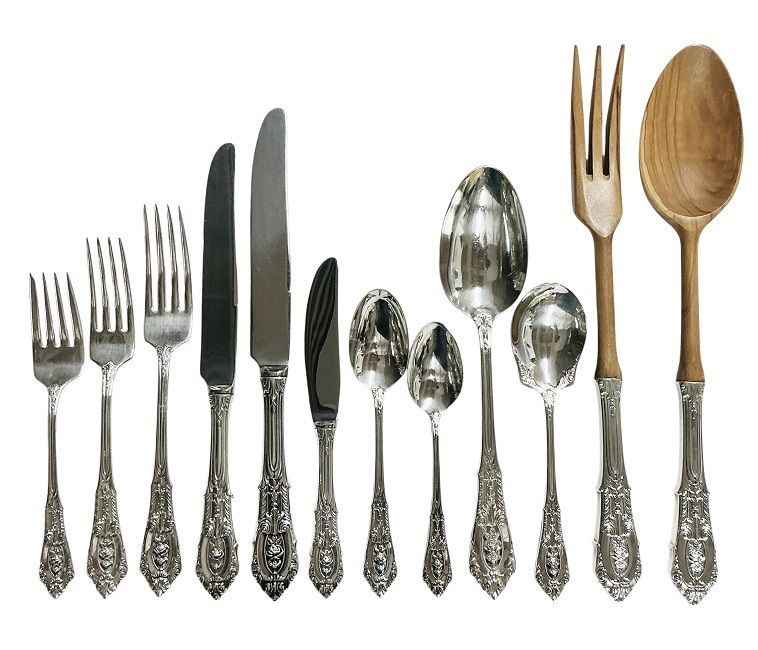 Large set of Wallace “Rose Point” sterling silver flatware, introduced in 1934 and popular ever since!  The pattern was inspired by the intricate details of needlework and lace work, showing scrollwork, roses and pierced handles.  This large and comprehensive set is comprised of 12 place settings of 8 pieces per place setting, and 5 serving pieces. The handsome silverware chest is available separately.