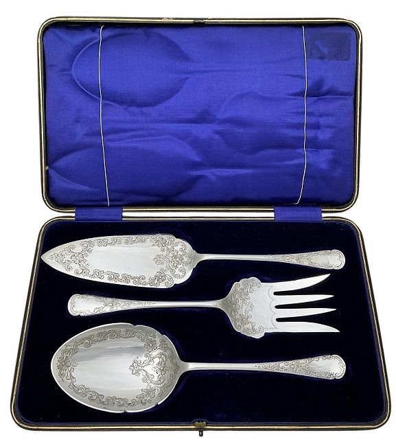 Late Victorian silver plate dessert serving set, in the original presentation box.  Made by Allen & Darwin *, circa 1890s.  The handsome set is designed with a delicate floral scroll pattern engraved onto a simple silhouette; the perfect mix of Victorian exuberance and Edwardian simplicity!  The set is in very good condition and is not monogrammed, with the box shows very minor wear only to the exterior.  A perfect choice for a shower or wedding gift.