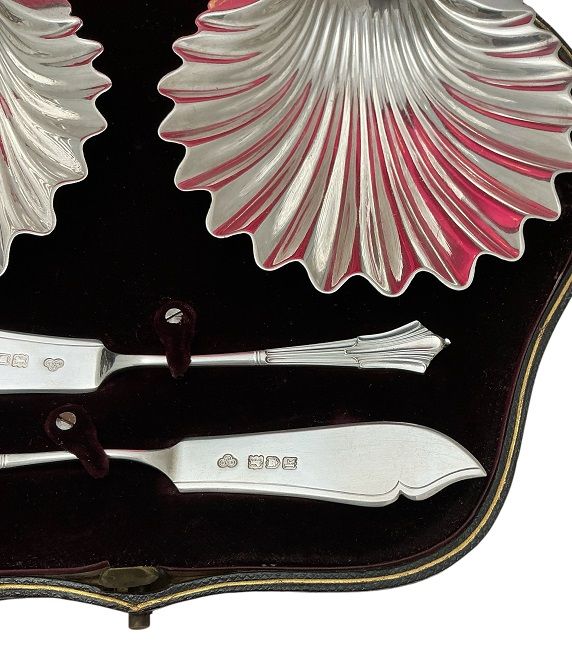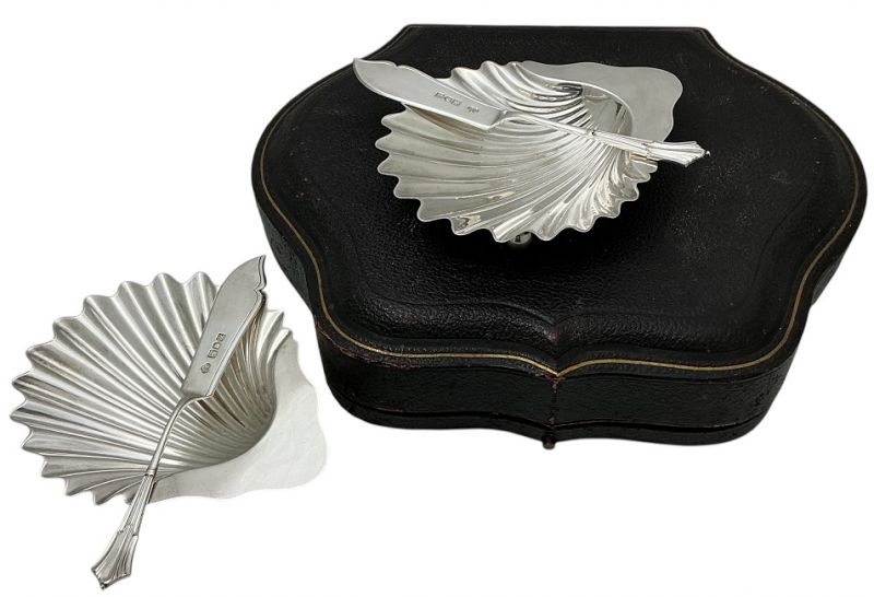 Goldsmiths & Silversmiths Shell Butter Dishes & Knives, London 1905, Original Box