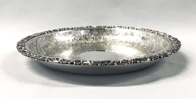 Barker Ellis silver plate shallow bowls, featuring beautiful hand chasing and engraving with floral scrolling.  Trademarked with the Barker Ellis menorah mark first used in 1912 and “Made in England”.