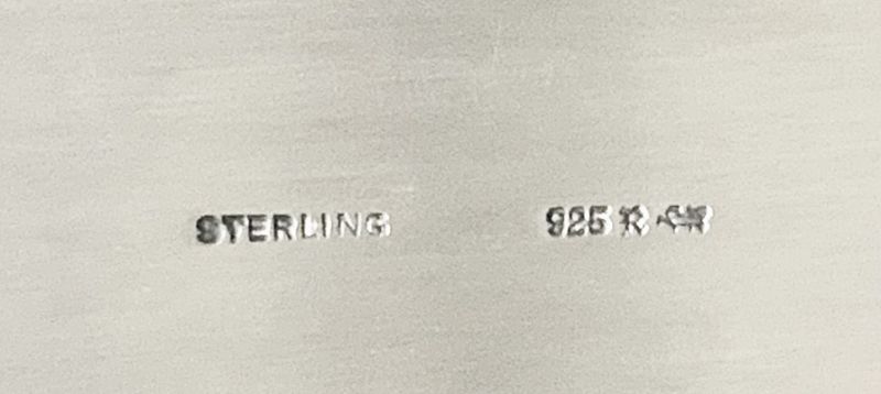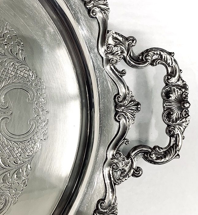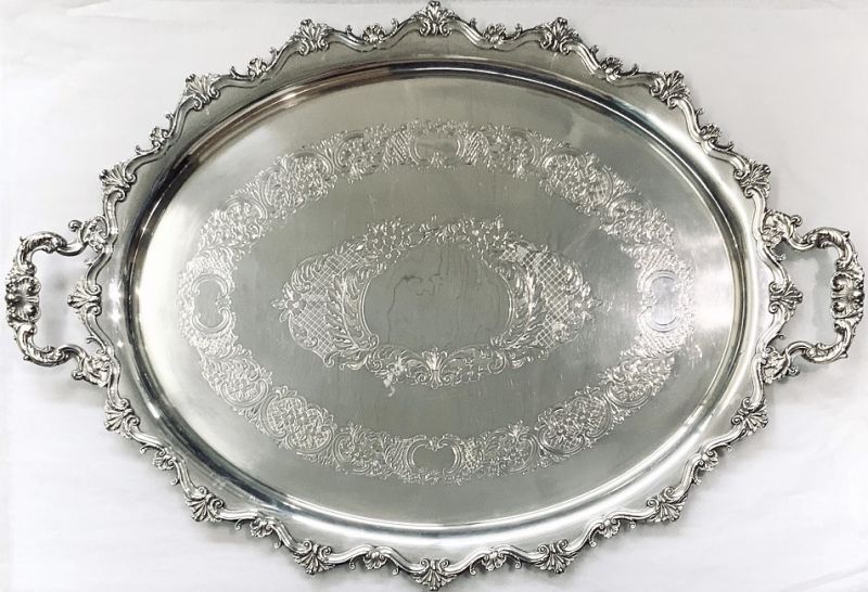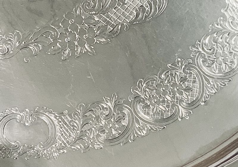 Substantial sterling silver tea tray, Roden Brothers, Toronto, circa 1940.  The oval tray is beautifully hand engraved with two bands of floral scrolling, with a central blank cartouche suitable for a monogram or presentation engraving.  The rim and handles are shaped and moulded with a shell motif; styled in the fashion of George II era silver trays of the mid-1700s.