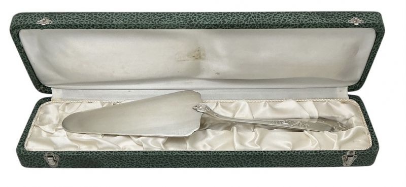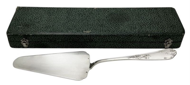Antique silver plate cake / pie server, made in France, early 20th century.  The satin finish highlights the relief of the floral scrolled designs on the handle.  The silversmith firm is unknown, but it is very similar in design to the Christofle pattern “Marly”.  With the presentation box.