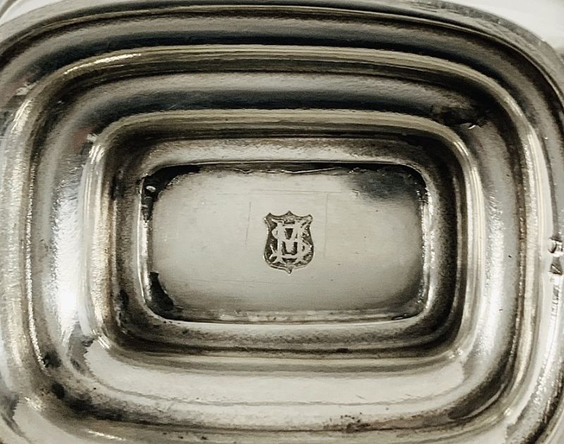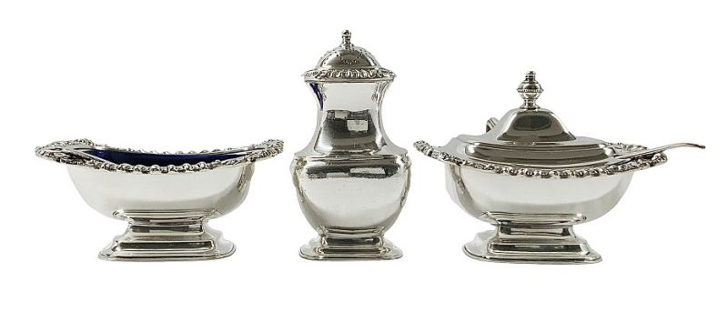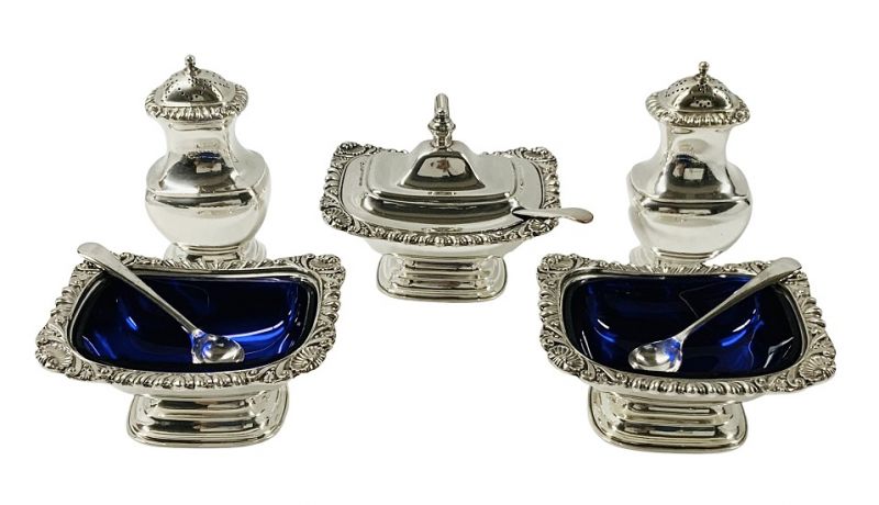 The salt cellars and the mustard pot have the original cobalt blue glass liners.