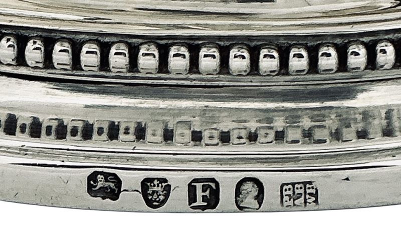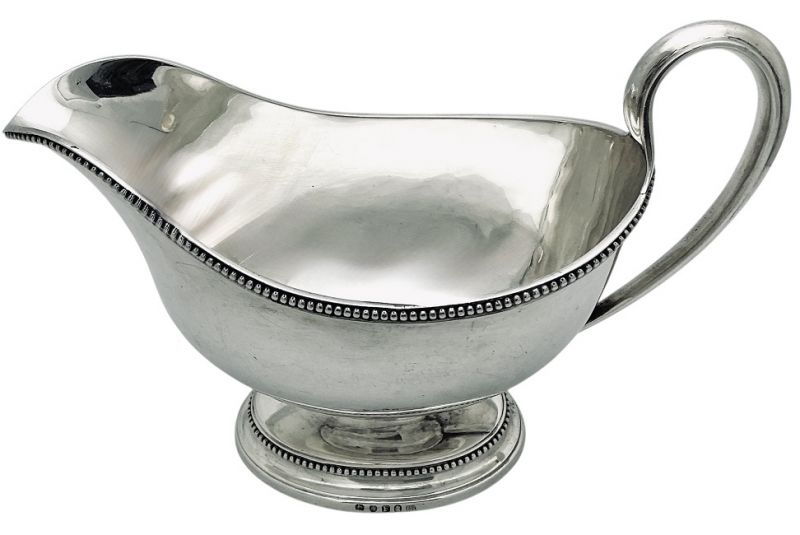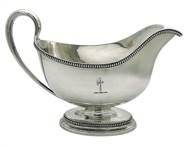A very handsome George III era sterling silver sauce (gravy) boat, hallmarked London 1801. From the prestigious multi-generation silversmith Bateman family.  This example is clearly marked PA AB WB, for Peter, Ann & William Bateman, with their mark registered and in use 1800-1805.  The robust shape is elegantly simple in form, with bead trim border at the rim and pedestal base.  Crested with a battle axe, long associated with the Jenkins family. *