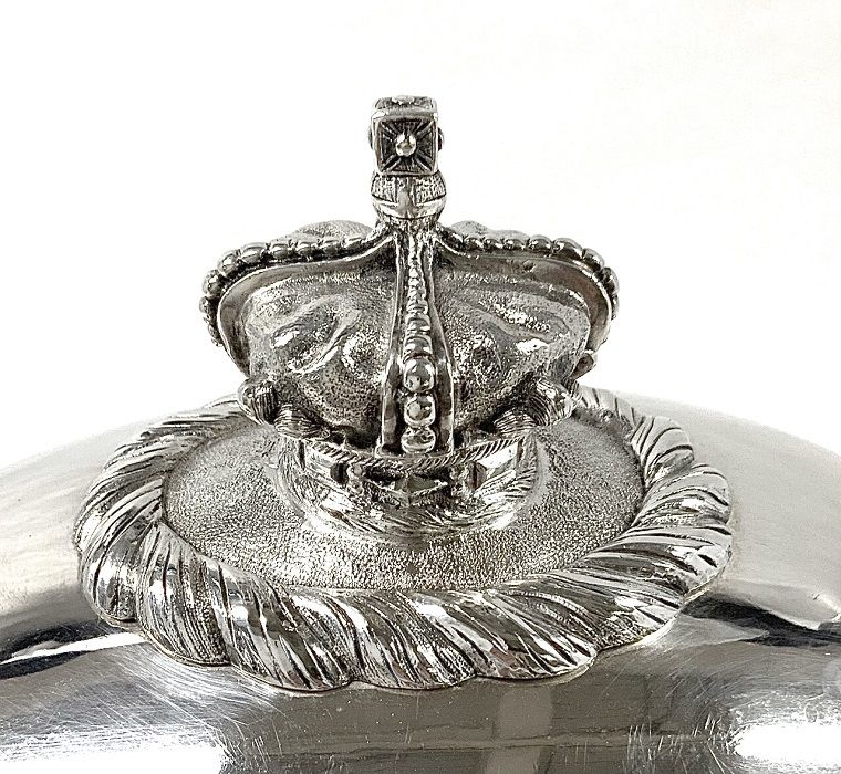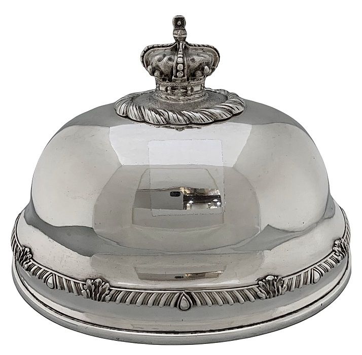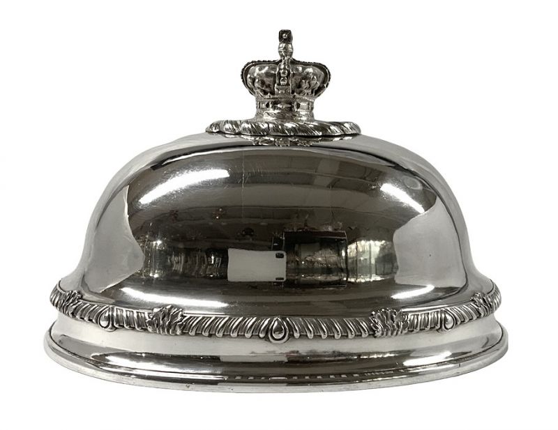 Victorian silver plate meat dome with unusual crown handle and gadroon and shell border.  Possibly a royalty commemorative for Queen Victoria’s 50th or 60th Jubilee years, in 1887 or 1897.  English, late 19th century.