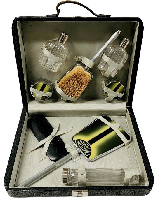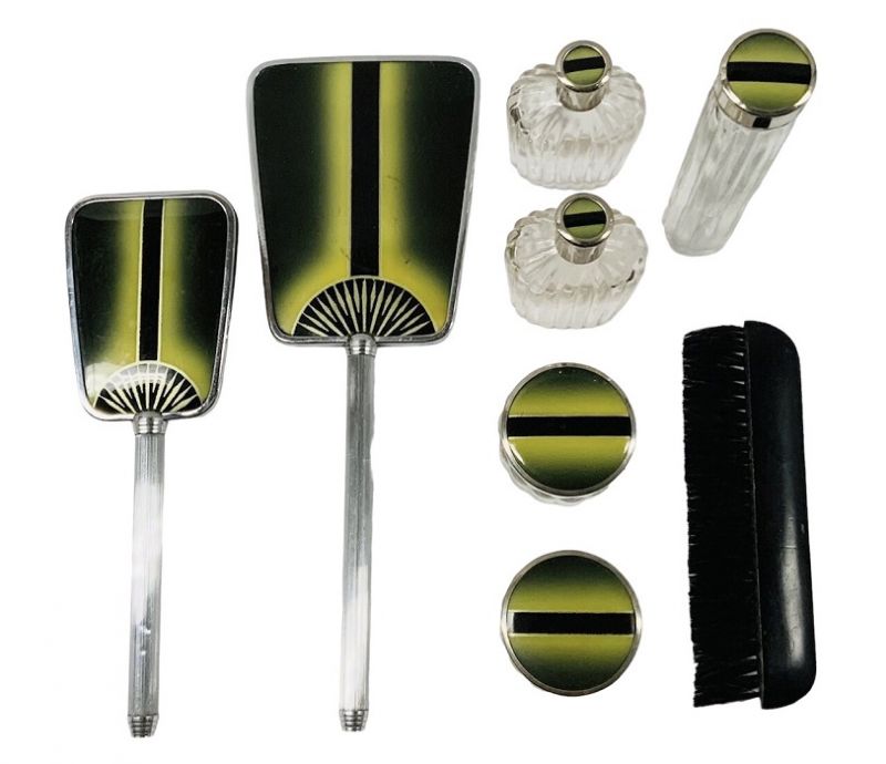 Art Deco boxed dresser set, finished in yellow, green and black on chrome, with glass jars and bottles.  Unmarked, attributed to USA, circa 1930-40.
