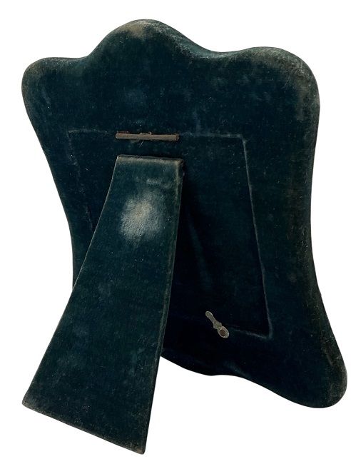 The elaborately floral decorated picture frame has two central blank cartouches, suitable for engraving.  The back of the frame has the original dark blue velvet, in good condition.