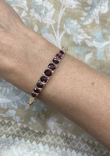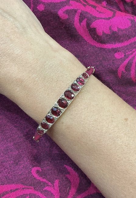 This lovely vintage 9kt. rose gold bracelet features 8 bead-set, oval facetted cut paste/imitation ruby.