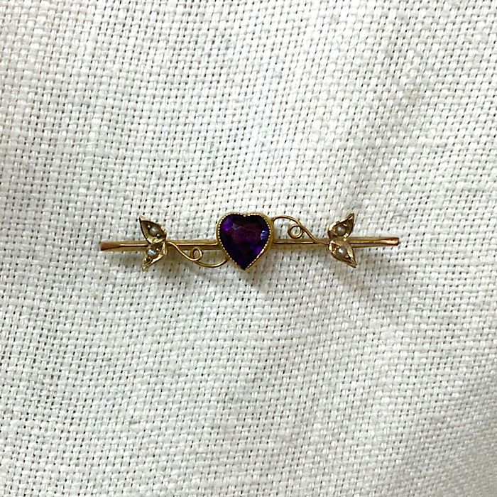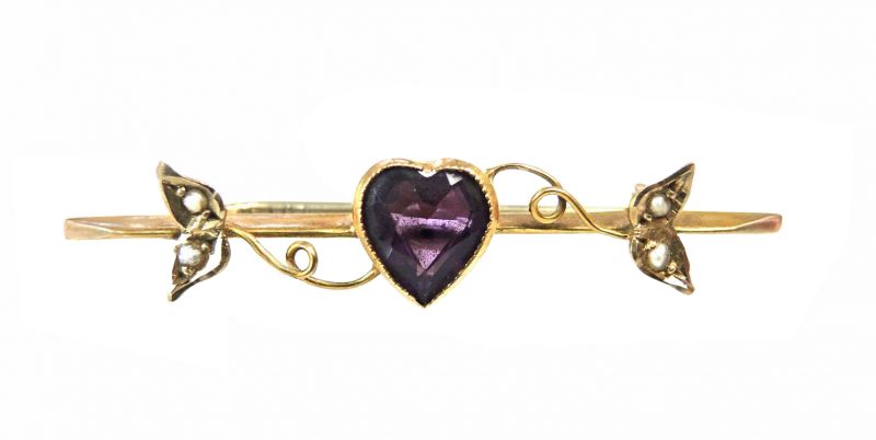 A pretty 9kt. yellow gold Edwardian amethyst and seed pearl floral bar brooch. The brooch is set with 1 heart facetted cut amethyst (Clarity: LI / Colour: Deep Purple) weighing approximately 0.93ct. The brooch is also set with 4 seed pearls (Colour: Creamy White) which measure approximately 1.5mm. The approximate weight of the brooch is 1.4gm and the dimensions are 1 1/2" (3cm) wide by 2/8" (1/2cm) long.