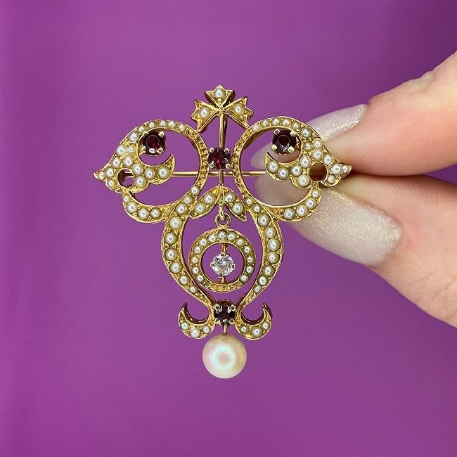 Vintage Diamond Garnet and Seed Pearl 14kt Brooch Pendant