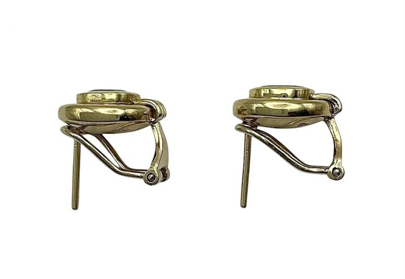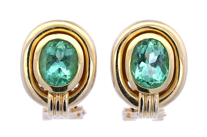 These 18kt. yellow gold modern earrings showcase two vibrant bezel-set, oval facetted emeralds weighing approximately 1.67cts.