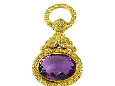 One 14 karat yellow gold fancy scroll finished fob. One amethyst (20.44 carats).