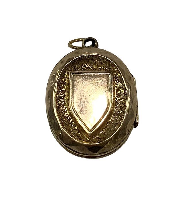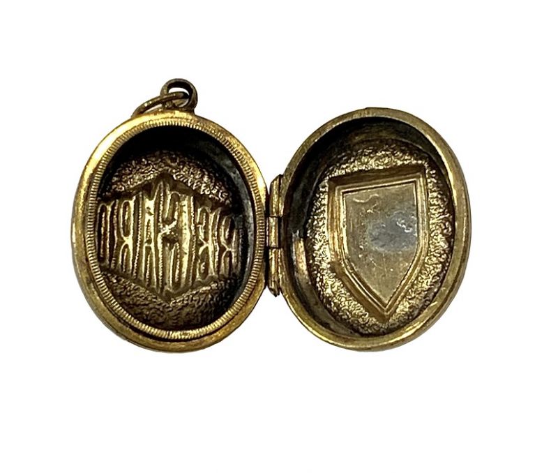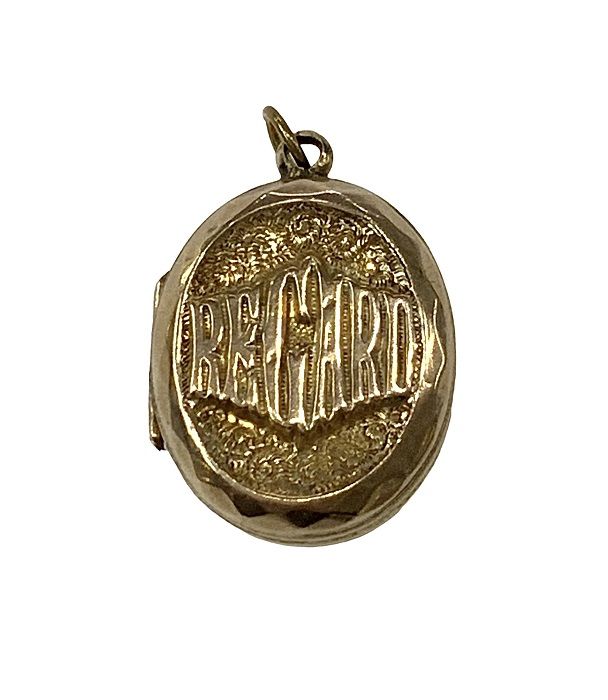 Victorian Gold Filled locket, with “REGARD” in raised lettering against a textured floral background.  The empty shield shaped panel on the reverse is the perfect place for a monogram.
