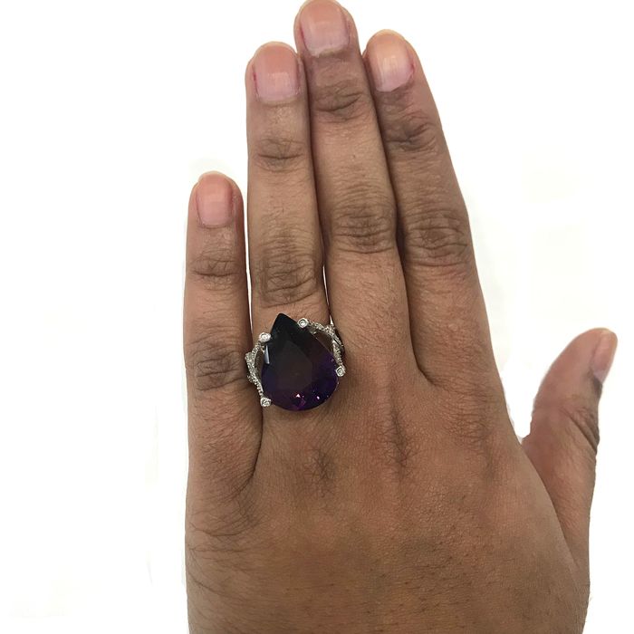 A stunning modern 18kt white gold ring that features 1 pear faceted cut medium intense purple and orange ametrine, est. 18.32ct; 36 round brilliant cut diamonds, est. 0.25ct (SI-I1 clarity & H-I colour) and 4 round brilliant cut diamonds, est. 0.03ct (SI-I1 clarity & H-I colour). It is currently size 6 and can be sized.