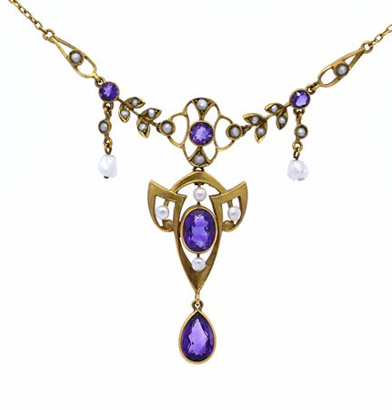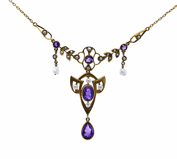 Antique 2.83ct Amethyst and Freshwater Pearl 14kt Lavalier Necklace