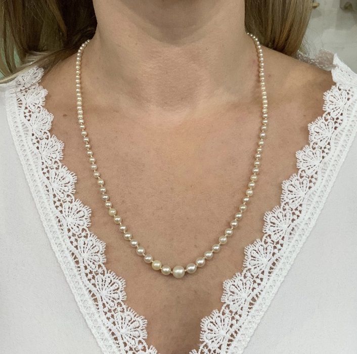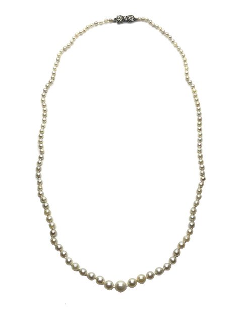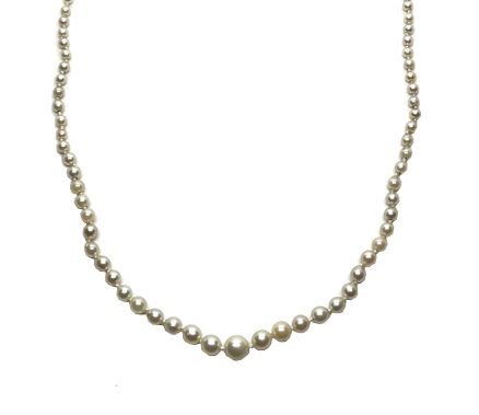 A pretty vintage strand of pearl necklace. The 115 off rounf to round, graduated, cultured pearl measure approximately 7.5mm to 2.1mm., creamy white body colour, lightly to heavily blemished, medium/good luster. The necklace has a silver interlocking clasp, inlaid with round shaped, rose cut pyrites, measuring approximately 1.7mm to 1.3mm. The necklace is to 22in. or 55.8cm. long and knotted.