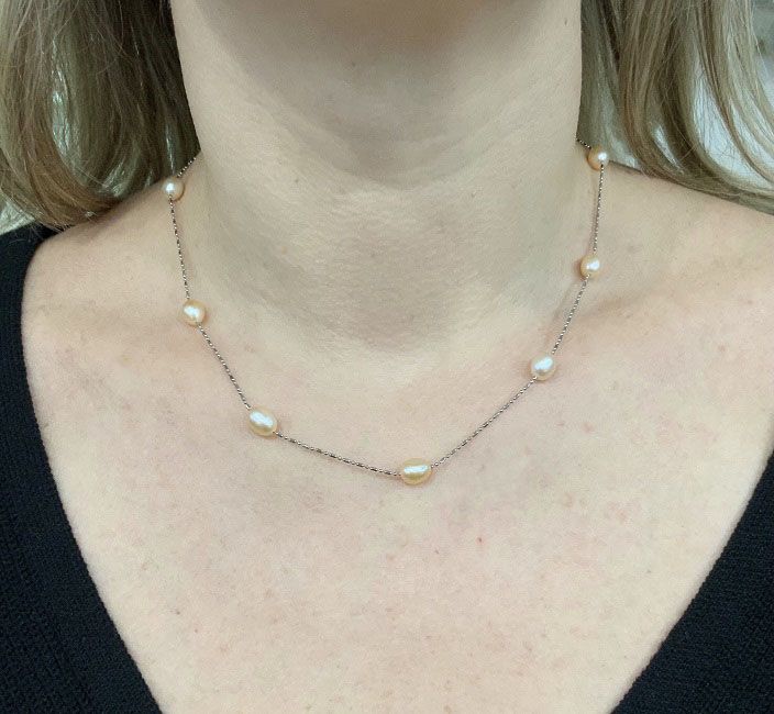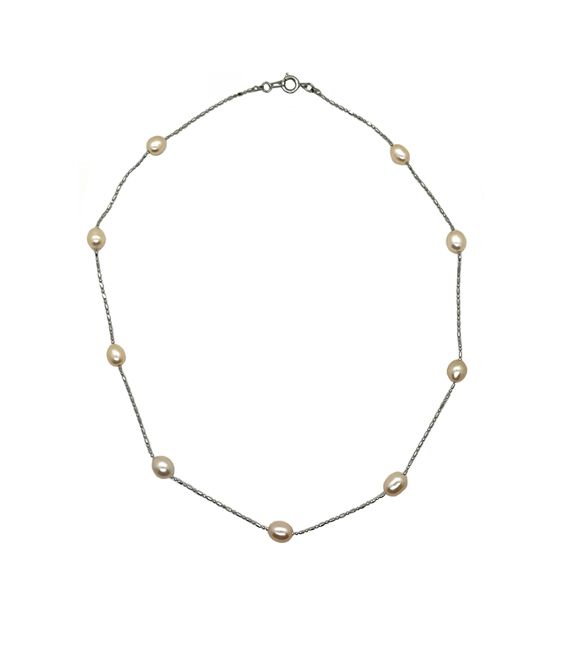 A vintage freshwater pearl station necklace. The raindrop link design necklace consists of 9 oval freshwater pearls (Colour: rosè with silvery overtone ) measuring approximately 7.8 x 6.2mm. The necklace is approximately 16.5in or 41.91cm in length. The approximate weight of the necklace is 4.3gm.