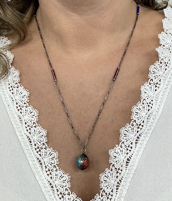 The pendant is egg-shaped finished with turquoise on one side and a red and black ladybug finish on the other.