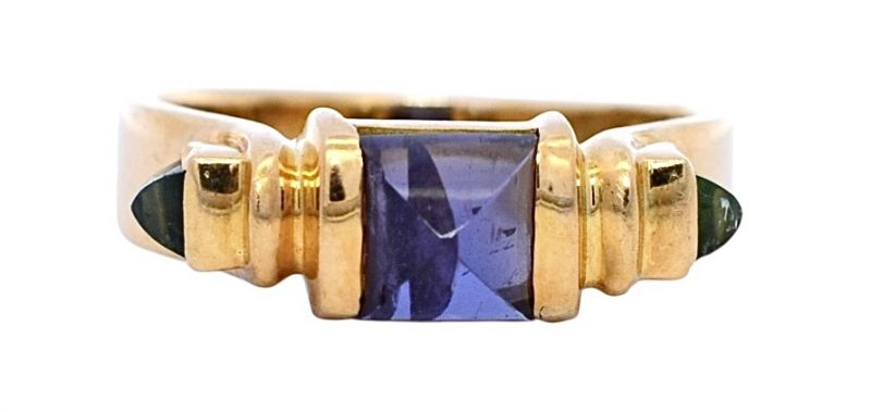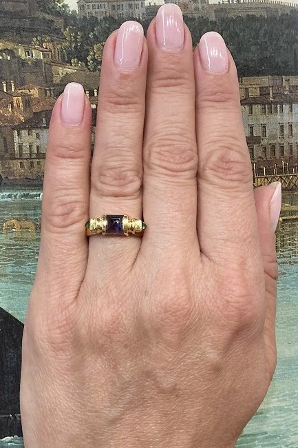 This 18kt yellow gold ring features one channel-set, square cut amethyst weighing approximately 1.04ct.