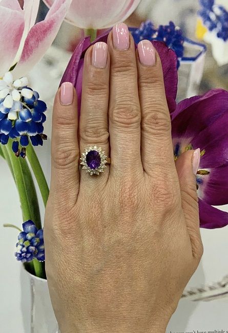 A beautiful vintage amethyst and diamond ring made in 14kt. yellow gold, c. 1970. The ring is set with 1 oval facetted cut amethyst (Clarity: LI / Colour: Medium Intense Purple) weighing approximately 2.80ct. The ring is also set with 32 round brilliant cut diamonds (Clarity: SI / Colour: H - I) which are estimated to weigh 0.68ct. total weight. The approximate weight of the ring is 6.1gm. It is size 6 and can be sized.