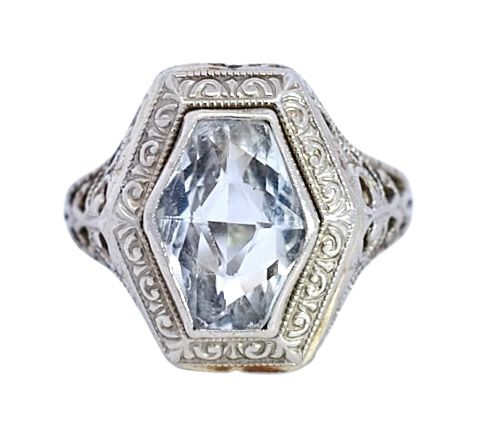 This incredible Art Deco 14kt. white gold filigree ring features one bezel-set, facetted elongated hexagonal cut aquamarine weighing approximately 1.21ct.