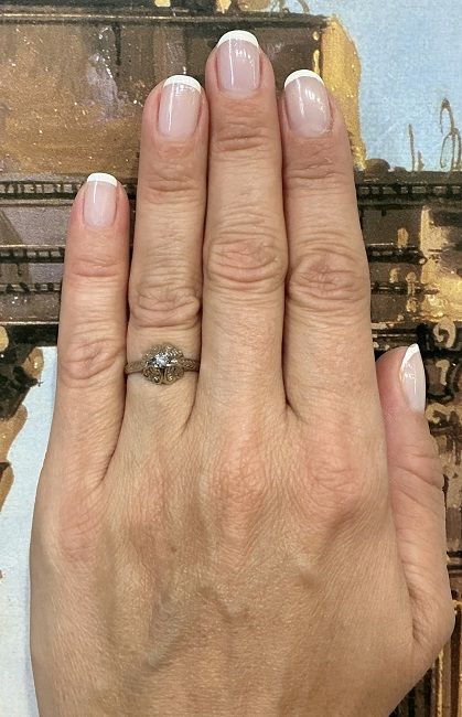 This lovely vintage 18kt. white gold ring features one claw-set, round brilliant transition cut diamond weighing approximately .12ct. (Clarity: VS2, Colour: H - I).