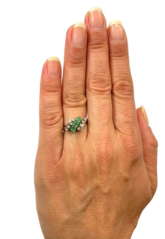 A beautiful vintage emerald and diamond ring set in 14kt. white gold. The vintage ring is set with 3 round facetted cut emerald (Clarity: HI / Colour: Medium Green) weighing approximately 0.38ct. total weight. The ring is also set with 8 single cut diamonds (Clarity: SI-I1 / Colour: H-I) which are estimated to weigh 0.16ct. total weight. The approximate weight of the ring is 3.7gm. It is currently size 7 and and be sized up or down. The ring weighs 3.7 grams.
