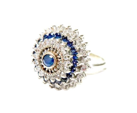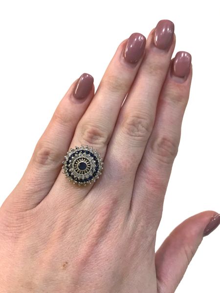 A beautiful vintage 14kt white gold ring that features 1 round faceted cut deep blue sapphire, est. 0.17ct; 20 round faceted cut deep blue sapphires, est. 0.56ct and 42 single cut diamonds, est. 0.63ct (VS-SI clarity & I-J colour).