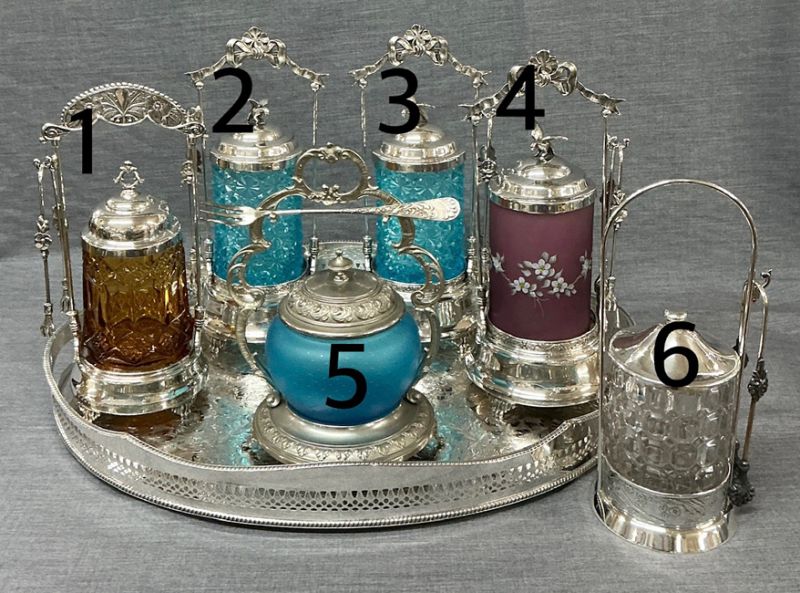 Victorian coloured and clear glass pickle castors, all with silver plate frames, covers and tongs / forks.  Not just for pickles; perhaps add a Victorian flavour to your bar cart……for ice, olives or other garnishes.