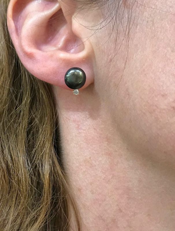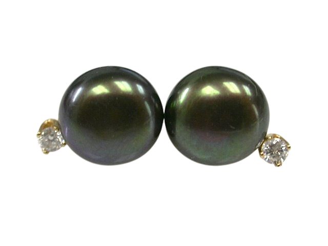 One pair of 14 karat yellow gold earrings. Two off-round black-greenish freshwater pearls. Two round brilliant cut diamonds (0.12 carats: SI-I1 clarity: G-H colour).