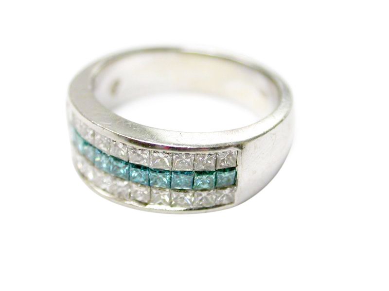 One 14 karat white gold band. Eleven princess cut treated blue diamonds (0.29 carats: VS-SI1 clarity: treated blue colour). Twenty-two princess cut diamonds (0.56 carats: VS-SI1 clarity: H-I colour).