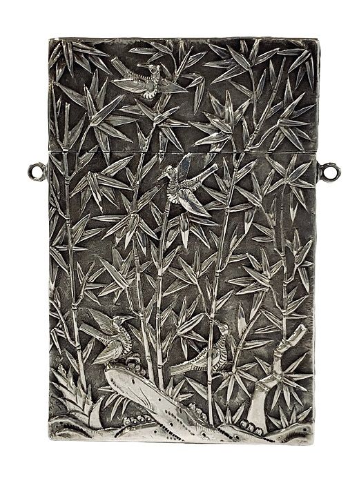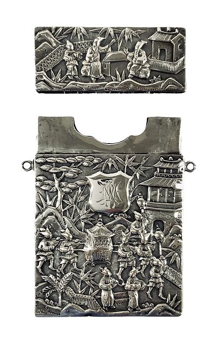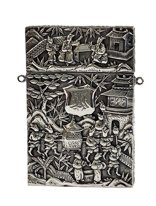 Chinese Export silver card case.  Made in China for export to the west, circa 1890-1900.    The loops on the sides were for attaching a chain for a lady to carry.  It is large enough to hold standard size business or credit cards for 21st century use.  The card case has the original personalized monogram, a super imposed “MA”.