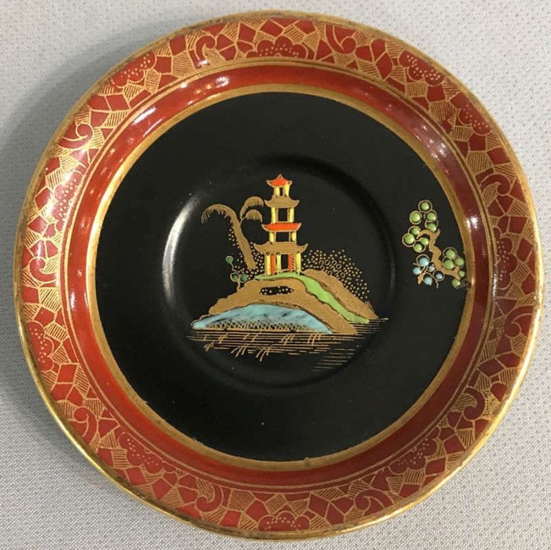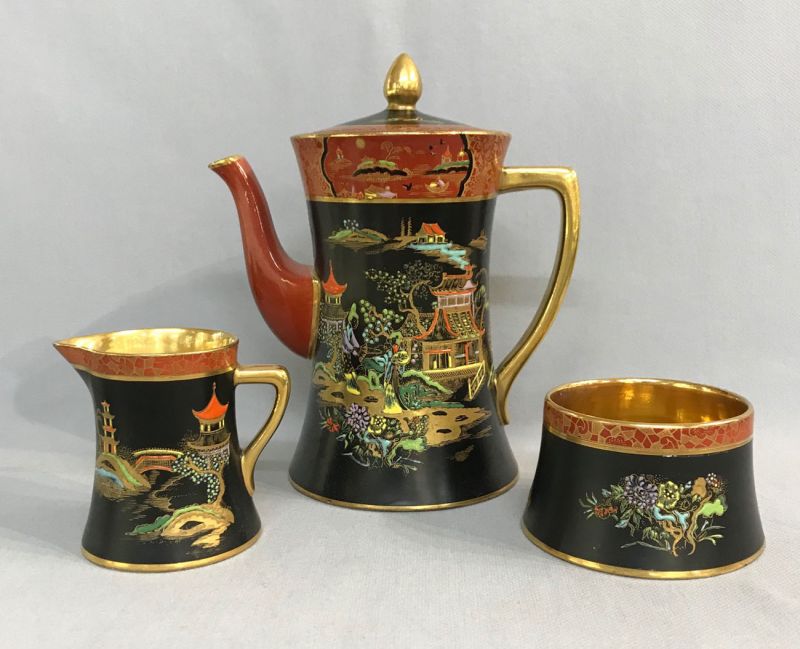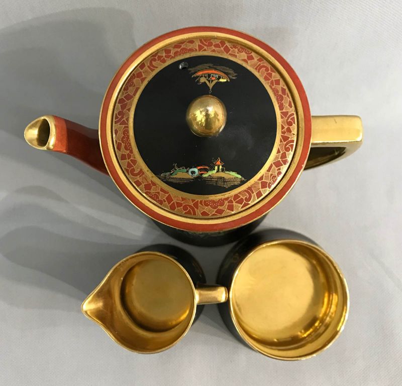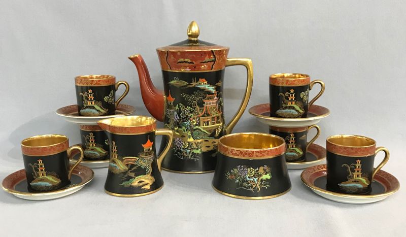 Art Deco Carlton Ware “New Mikado” chinoiserie coffee set.  Pattern # 2881, circa 1920-26.  The set is decorated throughout with bright enamels against a black and rust background featuring pavilions and gardens.  The gilding is bright and intact.