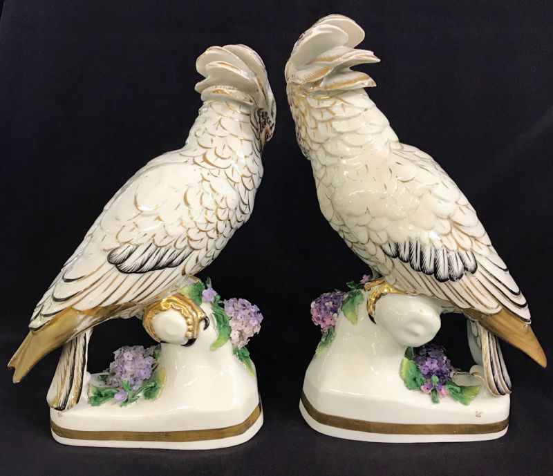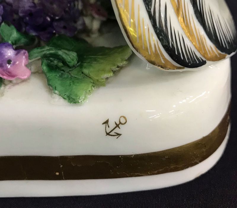 The trademark is an anchor type mark; possibly Samson imitating Chelsea, French, 19th century.  There is restoration to the larger figure and minor loss to the flowers.