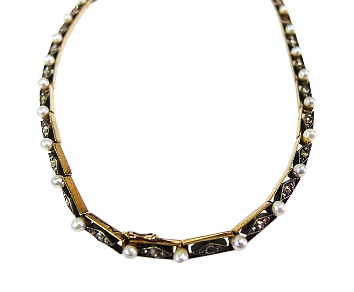 One custom-made 18 karat rose gold and silver top necklace. Thirty-two cultured pearls. Ninety-six rose cut diamonds (0.93 carats: SI-I1 clarity: J-K-L colour). The necklace is 14.5 inches in length.