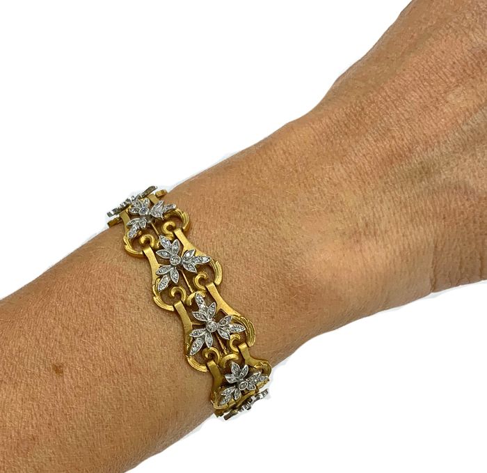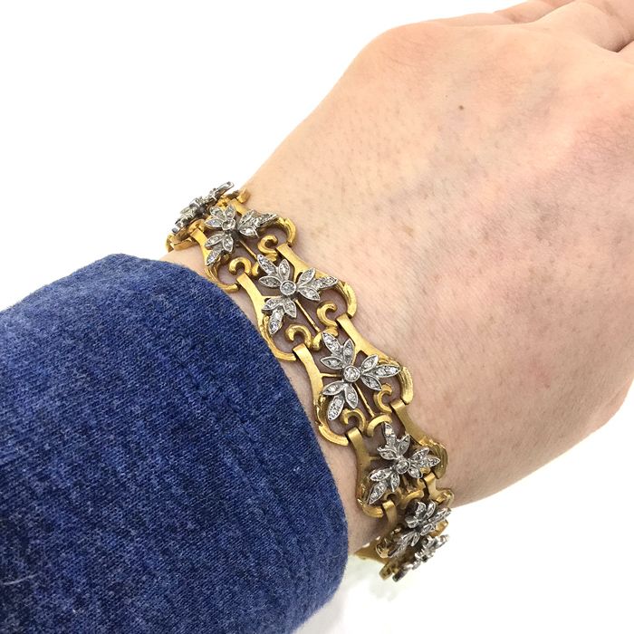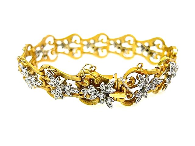A beautiful 18kt yellow and white gold floral bracelet featuring 12 round brilliant and single cut diamonds, est, 0.48ct (clarity:VS-SI & H-I-J colour) and 144 round brilliant and single cut diamonds, est. 1.98ct. (clarity: SI-I & H-I-J colour). It is approx. 7.25 inches (18.42cm) long and weighs 40.7 grams. It has a detachable safety chain.