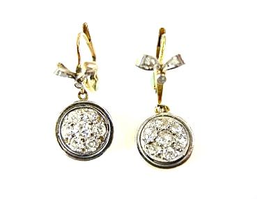 A beautiful pair of Edwardian platinum and 18kt yellow gold ribbon motif drop earrings featuring 2 old European cut diamonds, est. 0.19ct. (clarity: SI1-2 & colour: I-J); 12 old European cut diamonds, est. 0.62ct. (clarity: SI-I1 & colour: I-J) and 10 rose cut diamonds, est. 0.06ct. (clarity: SI & colour: I-J)