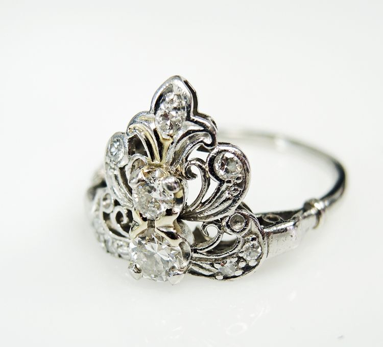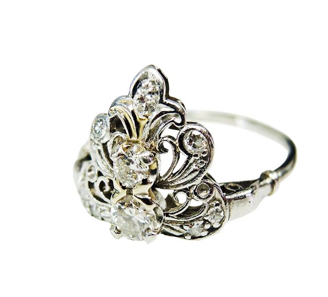 A beautiful and interestingly designed Edwardian "Fleur de Lis"  platinum mill grain ring with 1 old European cut diamond, est. 0.23ct (clarity:VS1 & H-I colour); 1 round brilliant cut diamond, est. 0.09ct (clarity:VS2 & H-I colour) and 7 single and French cut diamonds, est. 0.24ct (clarity:VS-SI & H-I colour).