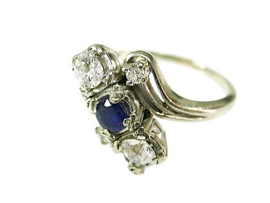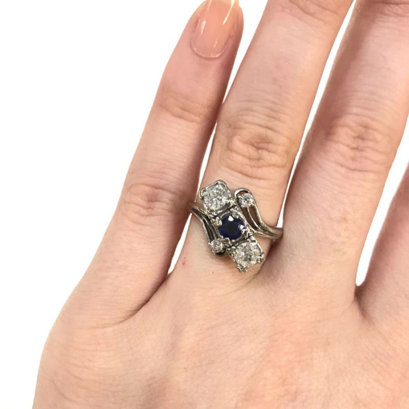 A pretty vintage 14kt white gold ring that features 1 round cut dark blue sapphire, est. 0.30ct., 2 old European cut diamonds, est. 0.60ct. (VS clarity: G - H colour) and 2 round brilliant cut diamonds, est. 0.12ct. (VS clarity: G - H colour). It is currently size 6.75 (6 3/4 loose) - 7 tight and can be sized.