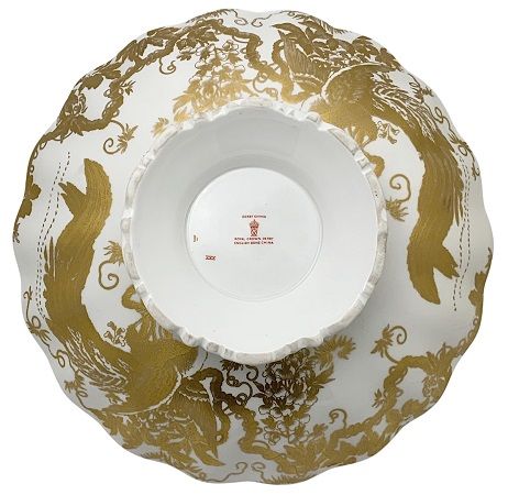 Royal Crown Derby “Gold Aves” Marquis centrepiece bowl.  The pedestal bowl is patterned inside the bowl and underneath. Royal Crown Derby date cypher for 1967.  The bowl is in excellent condition.