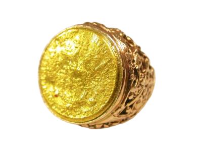 One man’s 10 karat yellow gold ring set with one 1915 Hungarian gold coin. The coin is set in a grape vine motif.