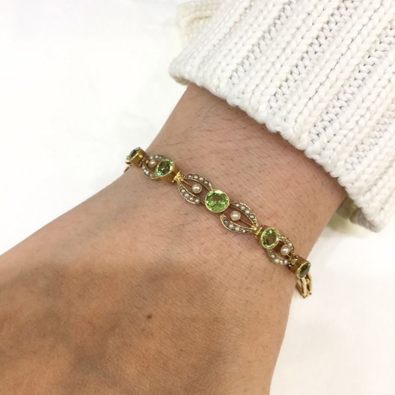 One 14 karat yellow gold Victorian bracelet. Five peridots (2.04 carats). Thirty-six seed pearls.