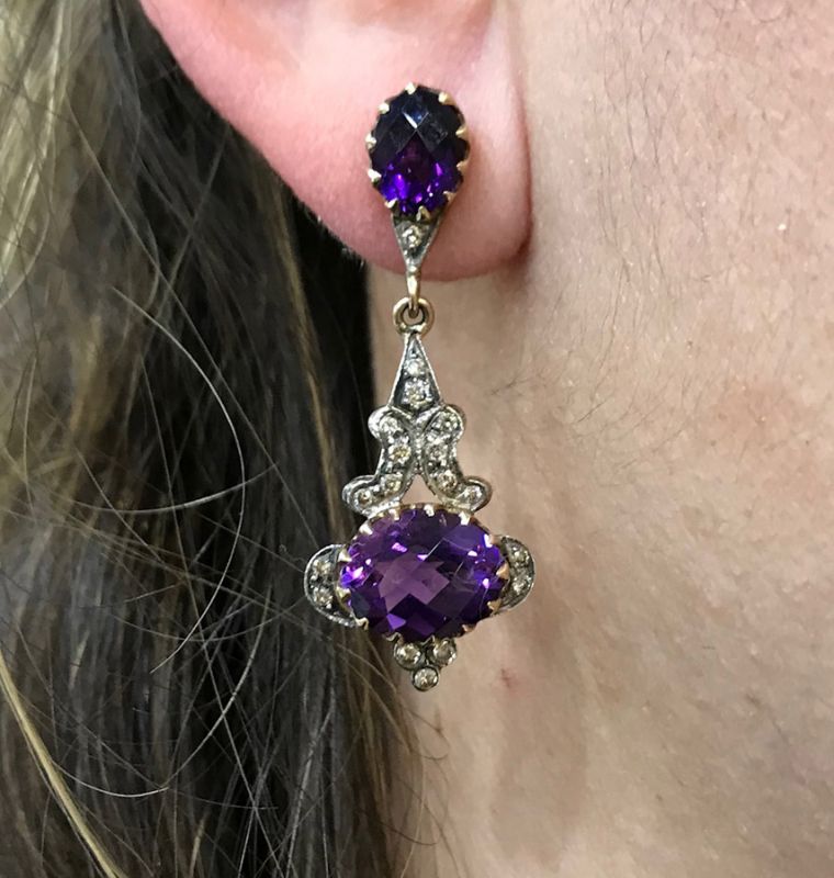 One pair of 18 karat yellow gold and silver top earrings. Four amethysts (8.45 carats). Thirty-six round brilliant cut diamonds (0.51 carats: SI clarity: L-M-N colour).