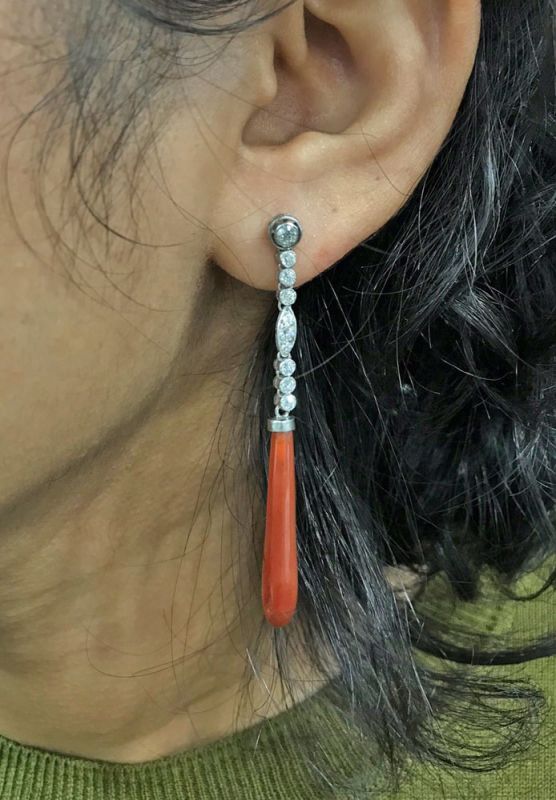 One pair of platinum drop earrings set with two polished briolette carnelian. Two old European cut diamonds (1.10 carats: VS-SI clarity: G-H colour).