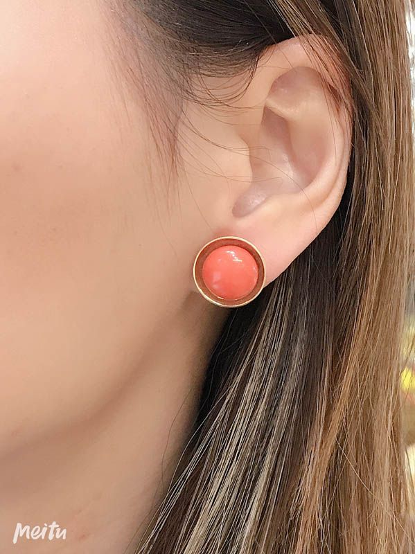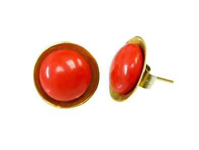 One pair of 18 karat yellow gold stud earrings. Two cabochon coral pieces.