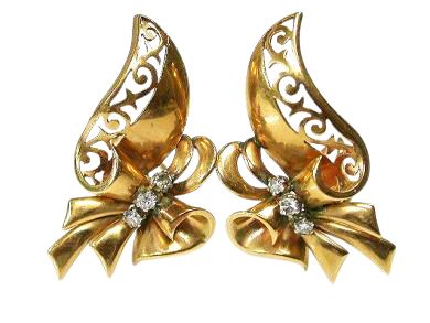 One pair of 18 karat yellow and white gold ribbon motif earrings. Six single cut diamonds (0.27 carats: VS-SI clarity: H-I colour).