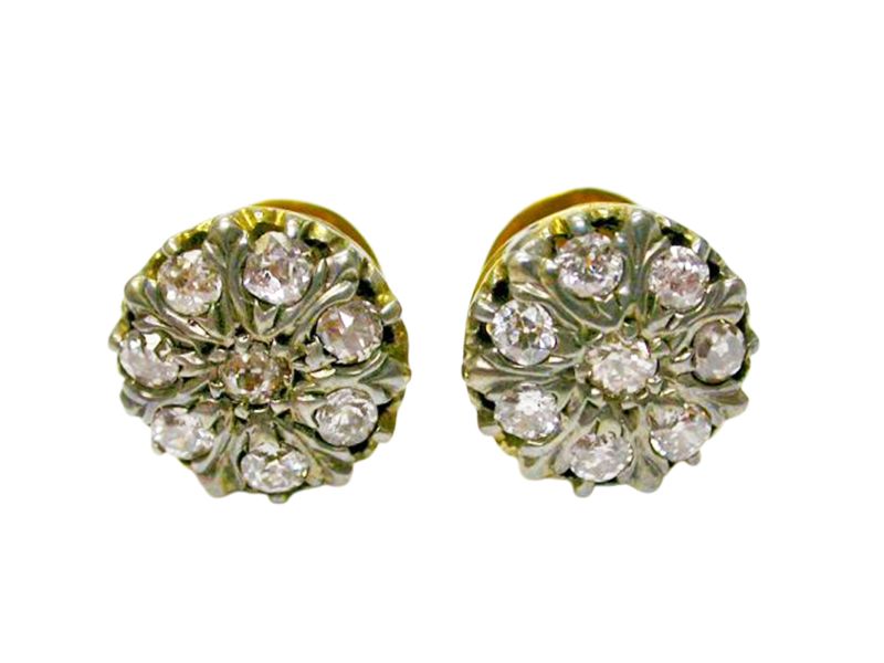 A beautiful pair of Edwardian 14kt yellow and white gold earrings featuring 16 old mine cut diamonds, est.1.20ct (SI-I clarity: F-G colour).