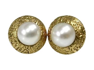 One pair of 14 karat yellow gold studs. Two cultured pearls with a silver colour and medium luster.