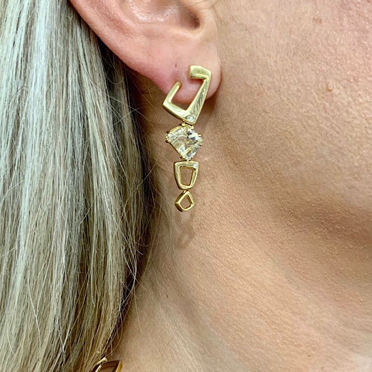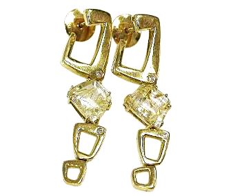 One pair of 18 karat yellow gold drop earrings. Two trapezoid cabochon rutilated quartz. Four round brilliant cut diamonds (0.04 carats: I1 clarity: H-I colour).