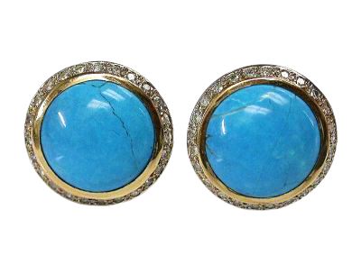 One pair of 14 karat yellow gold earrings. Two turquoise. Forty-eight round brilliant cut diamonds (0.96 carats: I1-I2 clarity: H-I colour).